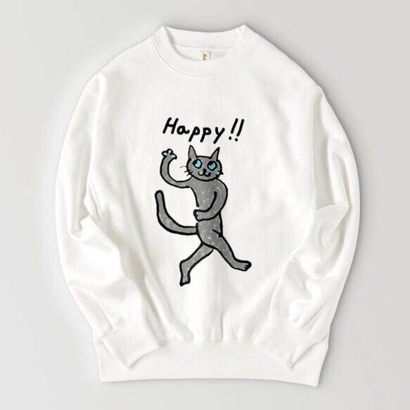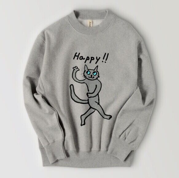 ハッピーキャット 猫 グレー猫 ロシアンブルー ゆるめ ユニセックス 裏起毛 あったか スウェット イラスト